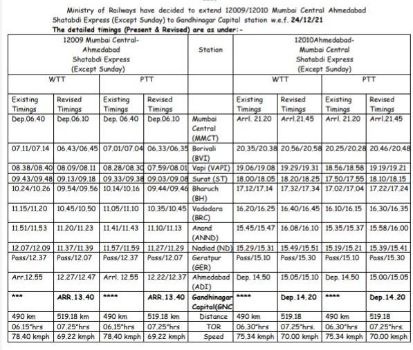 विस्तारित अहमदाबाद से गांधीनगर कैपिटल के बीच किसी भी स्टेशन का ठहराव नही दिया गया है। साथ के परिपत्रक में शताब्दी एक्सप्रेस के बदले और विस्तारित समय दिए गए है। यात्रीगण कृपया PTT अर्थात पब्लिक टाइम टेबल के समय अपनाए। एक्जिस्टिंग टाइम मतलब पुरानी समयसारणी और revised याने बदली समयसारणी है। 24 दिसम्बर से गाड़ी revised याने बदले समयों के अनुसार चलेगी।