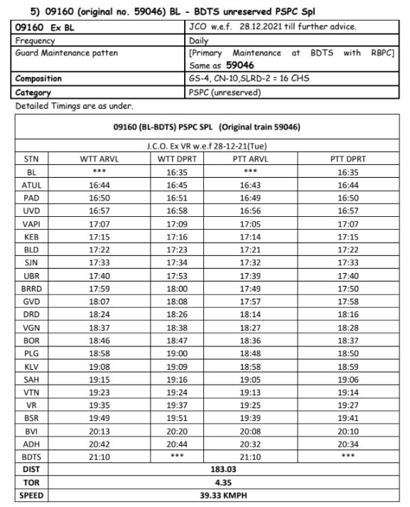 5: 09160 (59046) वलसाड़ बान्द्रा टर्मिनस प्रतिदिन अनारक्षित विशेष दिनांक 28 दिसंबर से चल पड़ेगी।