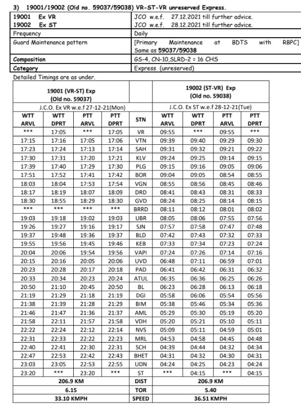 3: 19001 विरार सूरत अनारक्षित प्रतिदिन एक्सप्रेस दिनांक 27 से और 19002 सूरत विरार अनारक्षित प्रतिदिन एक्सप्रेस दिनांक 28 से चल पड़ेगी। यह गाड़ियाँ पूर्व में 59037/38 सवारी गाड़ी कर चलती थी।