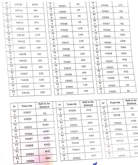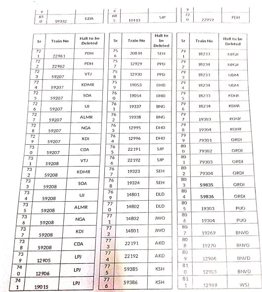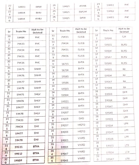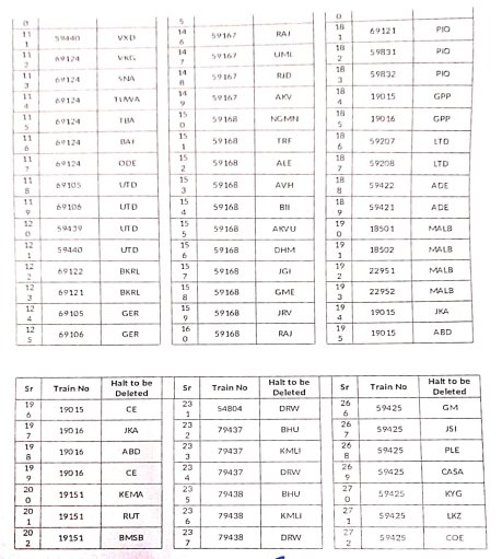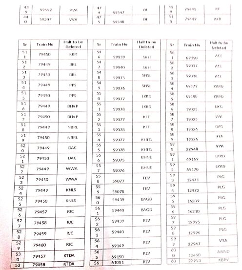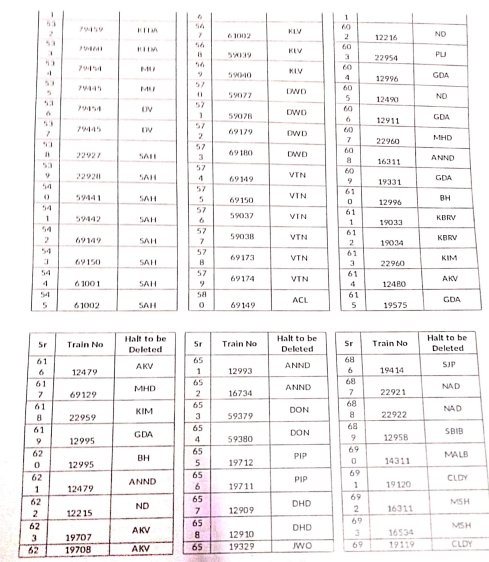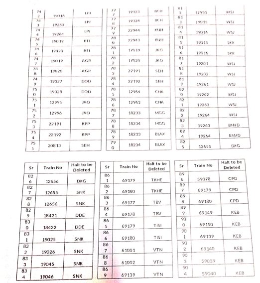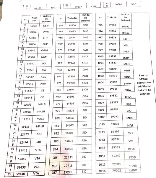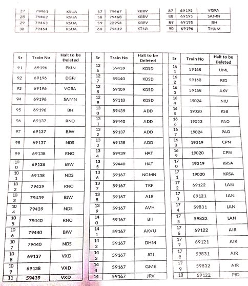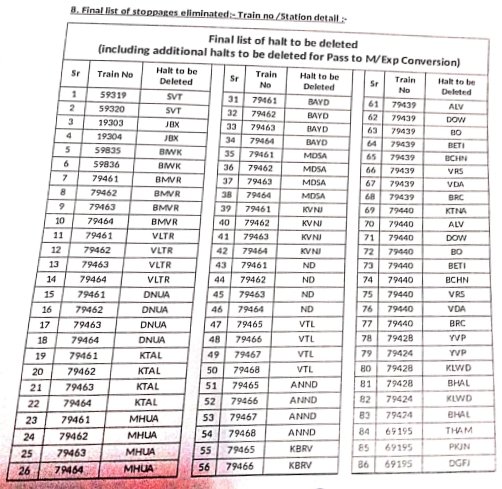 8: ठहरावोंका रद्द करना – 1016 स्टेशनोंकी इस सूची में वह ठहराव भी शामिल है जो सवारी गाड़ियोंके एक्सप्रेस में रूपांतरित किए जाने के बाद रद्द हो जाएंगे।