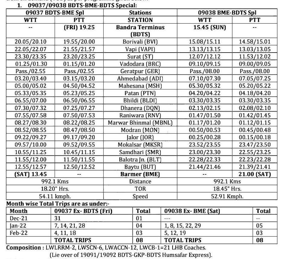 09037 बान्द्रा बाड़मेर साप्ताहिक विशेष दिनांक 31 दिसम्बर से 18 फरवरी तक प्रत्येक शुक्रवार को बाड़मेर के लिए चलेगी वापसीमे 09038 बाड़मेर बान्द्रा साप्ताहिक विशेष दिनांक 01 जनवरी से 19 फरवरी तक प्रत्येक शनिवार को बाड़मेर से चलेगी। 21 कोच की इस गाड़ी में 12 वातानुकूल थ्री टियर, 6 द्वितीय श्रेणी शयनयान स्लिपर, 2 LRRM और 1 पेंट्रीकार रहेगी। यह गाड़ी 19091/92 बान्द्रा गोरखपुर बान्द्रा हमसफ़र एक्सप्रेस के लाय ओवर समय मे समायोजित की गई है। यात्रीगण से निवेदन है, निम्नलिखित समयसारणी के PTT (पब्लिक टाइमटेबल) समय ही ध्यान में लेवे। WTT याने वर्किंग टाइमटेबल होता है जिसका उपयोग रेल्वके परिचालन विभाग हेतु बनाया गया रहता है।