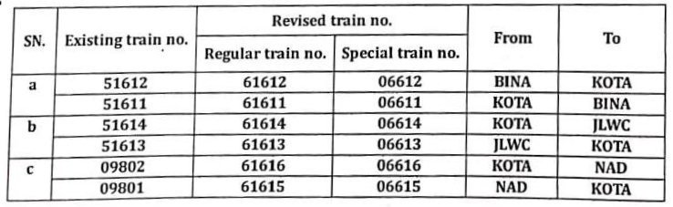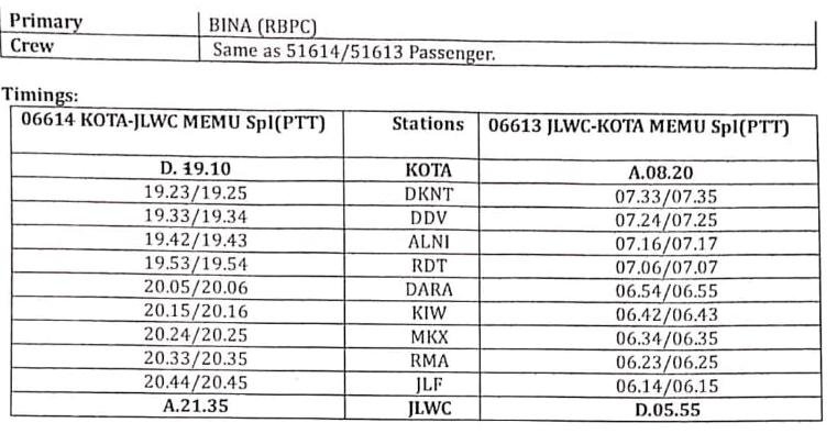 प म रेल में 3 जोड़ी प्रतिदिन विशेष अनारक्षित मेमू गाड़ियाँ चलनेवाली है। 06612/11 बीना कोटा बीना, 06614/13 कोटा झालावाड़ सिटी कोटा, 06616/15 कोटा नागदा कोटा