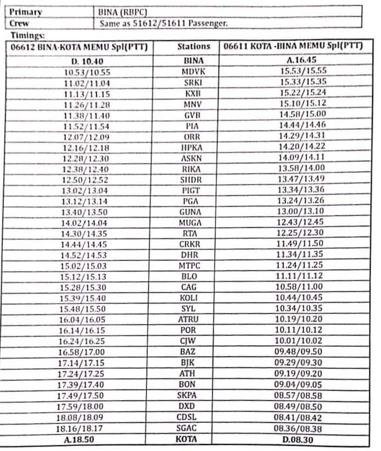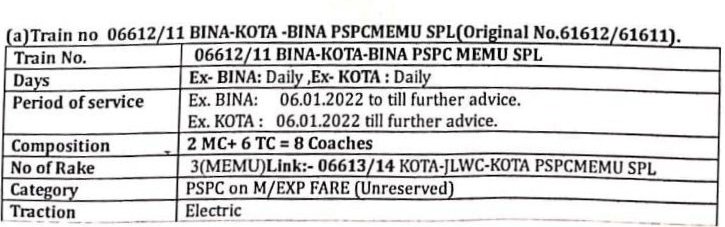 1: 06612/11 बीना कोटा बीना मेमू दोनोंही दिशाओंकी ओर से दिनांक 06 जनवरी से प्रतिदिन चल पड़ेगी।