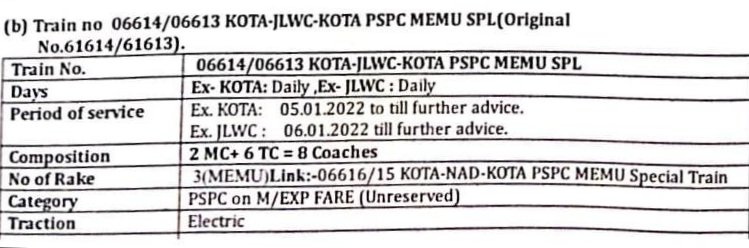 2: 06614 कोटा झालावाड़ सिटी मेमू दिनांक 05 जनवरी से प्रतिदिन चल पड़ेगी और वापसीमे 06613 झालावाड़ सिटी कोटा मेमू दिनांक 06 जनवरी से प्रतिदिन चल पड़ेगी।
