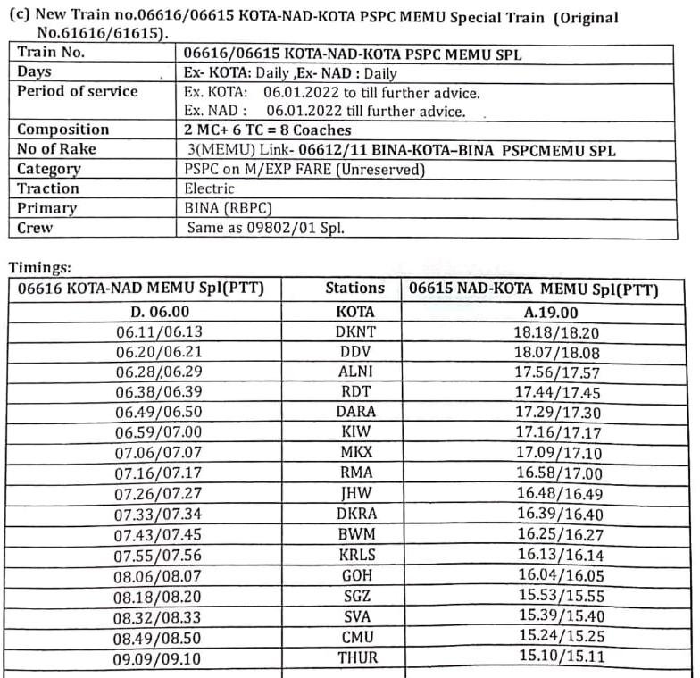 3: 06616/15 कोटा नागदा कोटा मेमू दोनोंही दिशाओंकी ओर से दिनांक 06 जनवरी से प्रतिदिन चल पड़ेगी। यात्रीगण कृपया ध्यान देंगे यह मेमू सेवा शुरू होने के साथ ही फ़िलहाल जो 09802/01 कोटा नागदा कोटा विशेष चल रही है, उसका परिचालन बन्द कीया जाएगा।