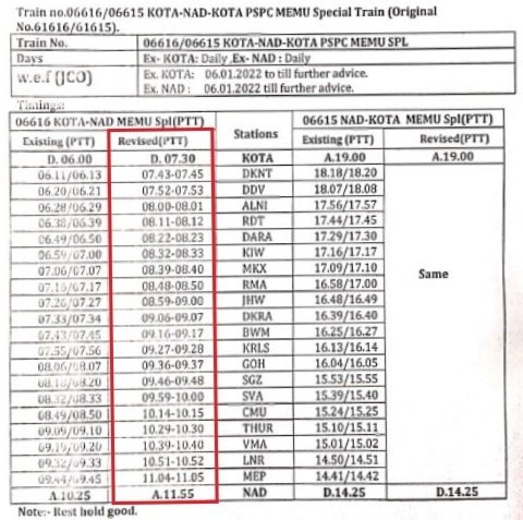 प म रेल की नियोजित 06616 कोटा नागदा अनारक्षित विशेष मेमू अपने पहले दौड़ से पहले ही समयसारणी का भारी बदलाव झेल रही है। प म रेल के परिपत्रक अनुसार परिचालन विभाग का समायोजन करने हेतु यह बदलाव किया गया है। वापसीमे 06615 नागदा कोटा गाड़ी में समय का कोई बदलाव नही किया गया है।