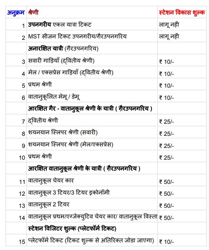 बीते वर्ष की आखरी तारीख का परिपत्रक, क्रमांक था, TC-II/2910/2020/SDF(3379934) सभी क्षेत्रीय रेल्वेज के नामे डायरेक्टर पसेन्जर मार्केटिंग का पत्र। विषय है, स्टेशन विकास शुल्क का निर्धारण एवं नियमावली। मित्रों, संक्रमण काल की यह रेल पहले से काफी अलग है। अलग अलग शुल्क और अलग अलग निर्धारण जैसे विशेष गाडियाँ, मेमू / डेमू विशेष मे समयसारणी तो सवारी गाड़ी की मगर किराए मेल/एक्स्प्रेस के और अब यह नया लीजिए, स्टेशन विकास शुल्क। भारतीय रेल्वे ने अपने कई रेल्वे स्टेशनोंका विकास / पूर्णविकास करना शुरू किया था। जिसमे हबीबगंज (रानी कमलापति स्टेशन ), गांधीनगर कैपिटल ऐसे विकसित स्टेशन है और भी कई स्टेशन का पूर्णविकास करने की रेलवे द्वारा घोषणा की गई है। यूँ तो यात्रीओंकी मानसिकता कई दिनों से तैयार कर ली गई थी, उक्त स्टेशनों पर जो भी विकास किया गया है उसके लिए यात्री को शुल्क चुकाना पड़ेगा, बस आज उसका दरपत्रक सामने आया है। हालांकि यह शुल्क निर्धारित स्टेशन पर लागू कब किए जा रहे इसका निर्धारण विकास करने वाली संस्था , संबंधित क्षेत्रीय रेल्वे को सूचित करने के बाद ही घोषित किया जाएगा।