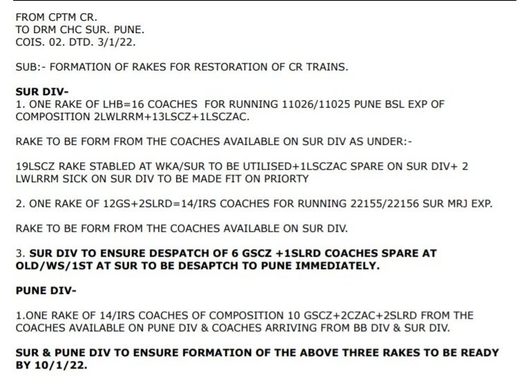 दिल थाम कर रखिए, मध्य रेल प्रशासन ने सोलापुर और पुणे मण्डल को उपरोक्त गाड़ियोंके रैक तैयार करने को कहे दिया है।