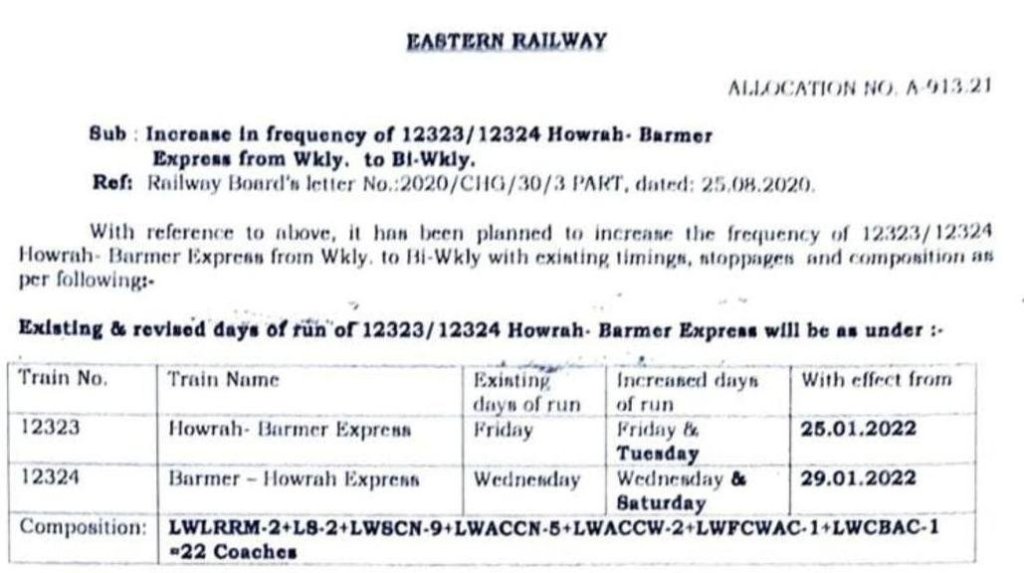 पूर्व रेलवे की 12323/24 हावडा बाड़मेर हावडा साप्ताहिक सुपरफास्ट के फेरे दिनांक 25/29 जनवरी से बढाए जा रहे है। समयसारणी में कोई फर्क नही किया जा रहा है।