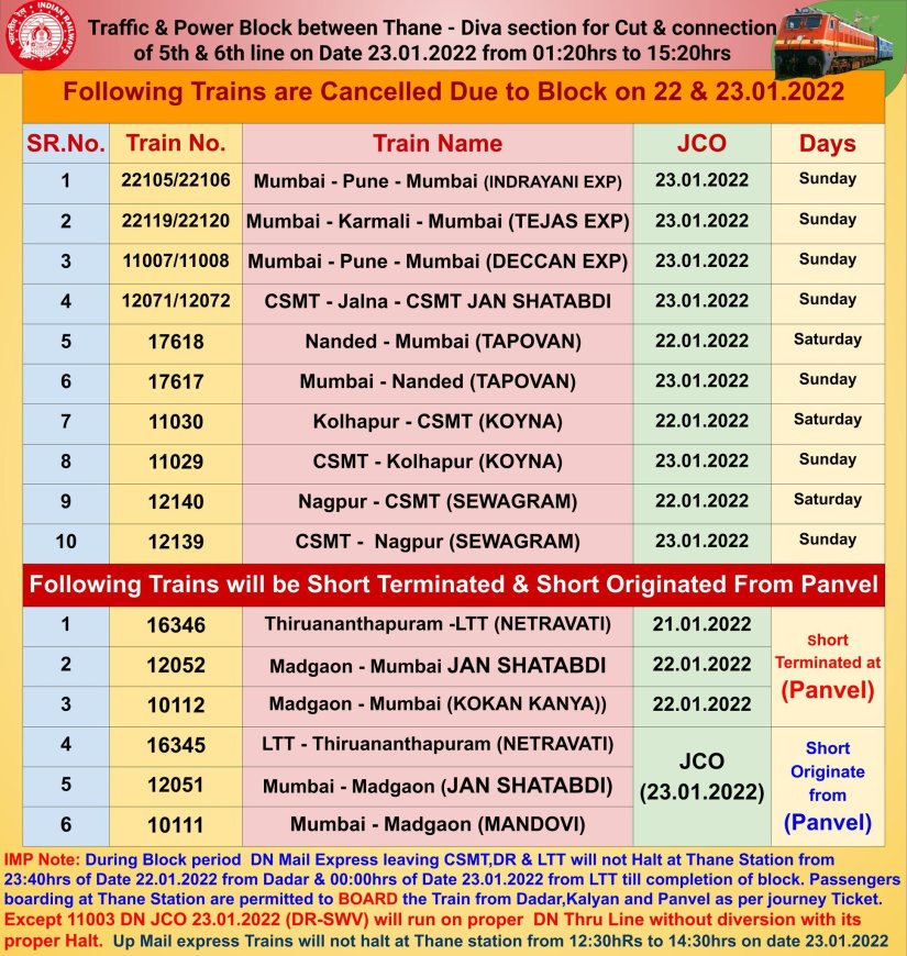 दिनांक 23 जनवरी को लोकमान्य तिलक टर्मिनस से 00;00 समय से, कल्याण की ओर चलनेवाली डाउन मार्ग की सभी मेल/एक्स्प्रेस गाडियाँ ठाणे स्टेशन पर नहीं रुकेगी। छत्रपती शिवाजी महाराज टर्मिनस मुम्बई, दादर और लोकमान्य तिलक टर्मिनस से अल-सुबह 2:00 से आगे और जब तक रेल ब्लॉक समाप्त न हो जाए तब तक की सभी मेल/एक्स्प्रेस/ उपनगरीय गाडियाँ माटुंगा से कल्याण तक स्लो मार्ग से चलेंगी और ठाणे स्टेशन पर नहीं रुकेंगी।