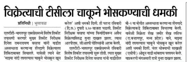 उपरोक्त खबर मराठी भाषा मे है। खबर का आशय यह है, दिनांक 16 जनवरी रविवार को लोकमान्य तिलक टर्मीनस से भागलपुर की ओर जानेवाली सुपरफास्ट मे मुख्य टिकट निरीक्षक दिनेश वसापा, भुसावल से खंडवा के दरम्यान अपनी विशेष टिकट जांच की ड्यूटी कर रहे थे। B-2 अर्थात वातानुकूल थ्री टियर कोच मे, बुरहानपुर स्टेशन के पास एक अवैध सिंगदाना विक्रेता को डिब्बे मे पाकर उन्होंने उसे टिकट की मांग की तो उसने चाकू से खून कर दूंगा ऐसा धमकाया और गाड़ी की खतरे की जंजीर खींचकर उसने गाड़ी को रोक वह चलता बना। इस मामले मे थाने शिकायत दर्ज की गई और उस विक्रेता को धरा भी गया है। कुछ इसी तरह का वाकया करीबन आठ दिन पहले मनमाड स्टेशनपर भी घटित हुवा। मनमाड स्टेशनके अवैध विक्रेताने गाड़ी के पेंट्रीकार के विक्रेता से मारपीट की और उसके पैसे छिन लिए।
