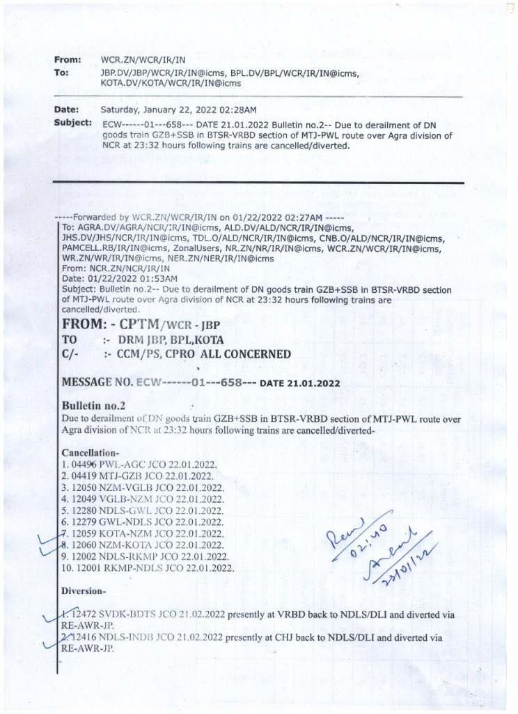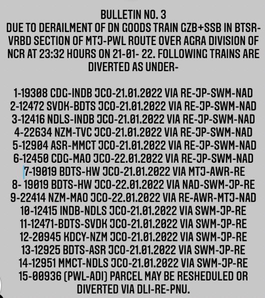 उत्तर मध्य रेल NCR में मथुरा – पलवल खण्ड पर, भूतेश्वर वृंदावन रोड स्टेशनोंके बीच एक मालगाड़ी पटरी से उतर गई है। मार्ग की बहुतांश नियमित यात्री गाड़ियाँ, मार्ग परिवर्तन कर चलाई जा रही है। यात्रीगण से निवेदन है, कृपया रेलवे के हेल्पलाइन 139, वेबसाइट/ऍप NTES से अधिकृत जानकारी प्राप्त कर अपनी रेल यात्रा का नियोजन करें।
