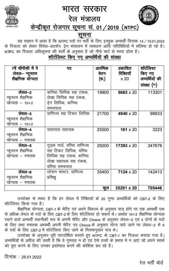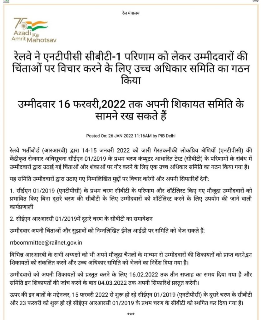 Uncategorisedरेलवे RRB-NTPC परीक्षार्थियों की समस्याओं पर विचार करने रेलवे ने उच्च अधिकार समिति का गठन किया। 26th Jan 2022 Rail Duniya RRB-NTPC के उम्मीदवार अपनी परीक्षाओं से सम्बंधित जो भी चिन्ता, समस्या, प्रश्न, सुझाव है, कमिटी को ई मेल द्वारा भेज सकते है। Share this: Share on WhatsApp (Opens in new window) WhatsApp Share on X (Opens in new window) X Share on Facebook (Opens in new window) Facebook Share on Telegram (Opens in new window) Telegram Email a link to a friend (Opens in new window) Email Like Loading... Related Published by Rail Duniya Rail Duniya is a magazine publishing all India train timings since 1988. View all posts by Rail Duniya