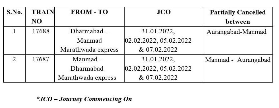 उपरोक्त तिथियों को मराठवाड़ा एक्सप्रेस औरंगाबाद से मनमाड़ के बीच, दोनोंही दिशाओंमें रद्द रहेगी, नही चलेगी।