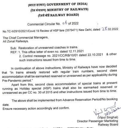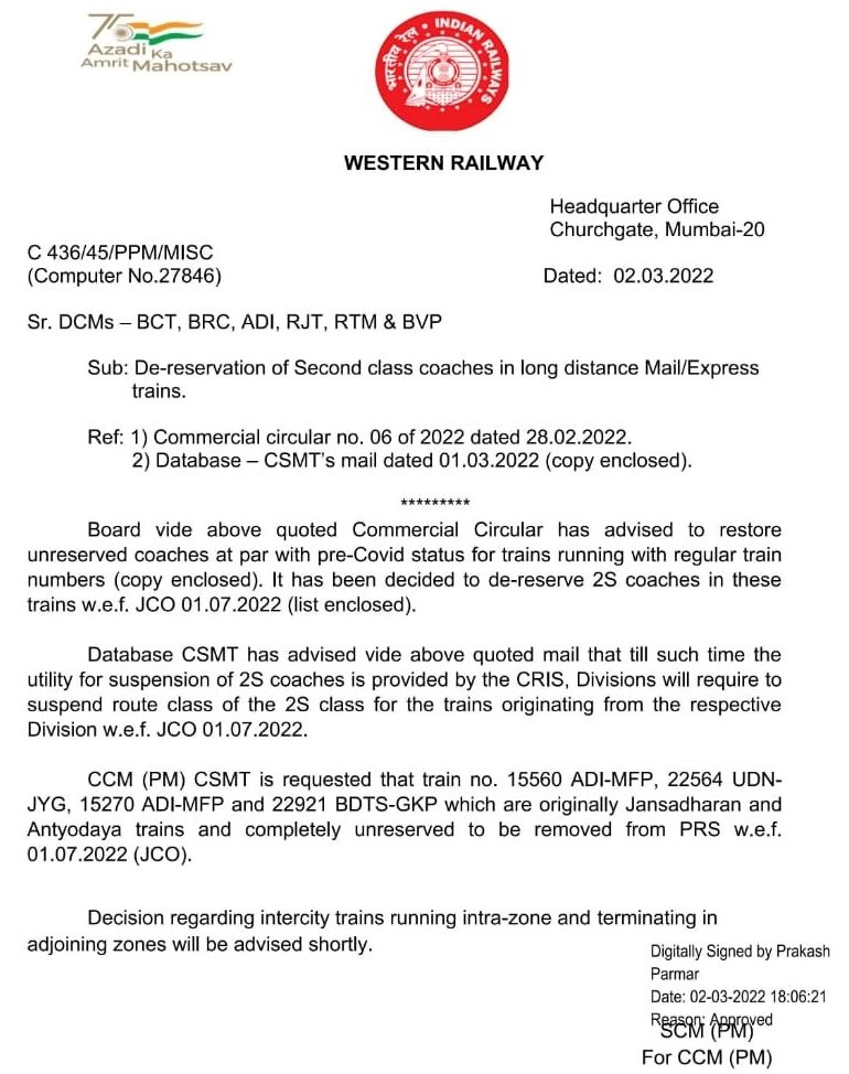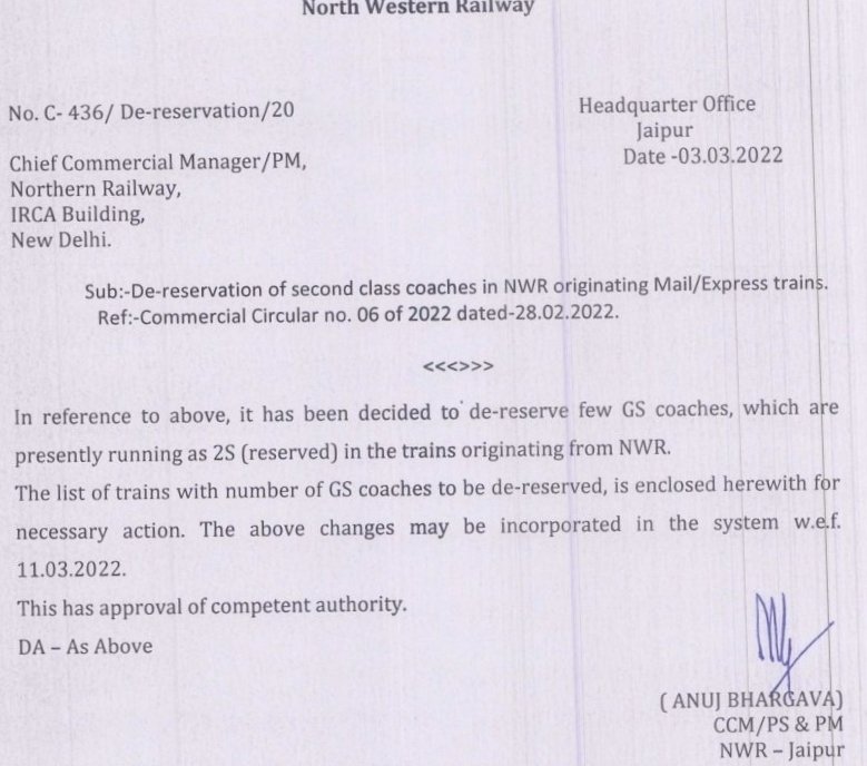 भारतीय रेल मे द्वितीय श्रेणी साधारण अर्थात आम यात्री की भाषा मे चालू टिकट, जनरल टिकट का अनन्य साधारण महत्व है। ये वह टिकट है की, यात्री की बस इच्छा या अचानक ही रेल मे यात्रा करने की जरूरत, बस स्टेशन पहुँच जाइए, टिकट खिड़की से टिकट लीजिए और गाड़ी के द्वितीय श्रेणी जनरल डिब्बे मे यात्रा शुरू कर लीजिए। संक्रमण काल के दौरान यह सभी डिब्बे रेल प्रशासन ने अग्रिम आरक्षित व्यवस्था मे बदल दिए थे। सभी नियमित मेल/एक्सप्रेस गाडियाँ विशेष श्रेणी ‘0’ नंबर से चलाई जा रही थी। खैर, यह बात तो पुरानी हुई और अब रेल प्रशासन ने गाडियाँ नियमित गाड़ी क्रमांक से चलानी शुरू कर दी मगर आरक्षित द्वितीय श्रेणी 2S यह वर्ग बरकरार था। यात्रीओंकी लगातार मांग के चलते आखिरकार रेल प्रशासन ने सभी नियमित लंबी दूरी की मेल/एक्स्प्रेस/सुपरफास्ट गाड़ियों और जो भी ऐसी गाडियाँ है जिनमे द्वितीय श्रेणी के डिब्बों को 2S आरक्षित द्वितीय सीटींग मे बदला गया था जिनमे अंत्योदय, जनसाधारण आदि गाडियाँ शामिल है उनकी जनरल अनारक्षित श्रेणी को पुनर्स्थापित करने का आदेश जारी कर दिया। देखिए निम्नलिखित पत्र;