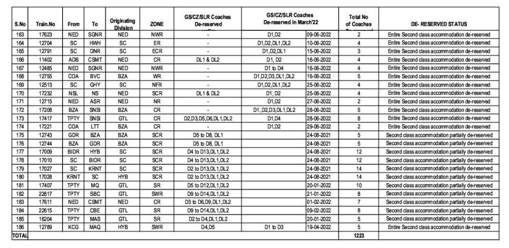 एक तरफ पश्चिम रेलवे WR ने अपने क्षेत्र से गुजरनेवाली इतर क्षेत्रीय रेलवे के स्वामित्व वाली 200 गाड़ियोंकी सूची जाहिर कर कह चुकी है, 01 जुलाई से ही उपरोक्त गाड़ियोंमे अनारक्षित द्वितीय श्रेणी शुरू हो पायेगी और अपने खुद के क्षेत्र की बहुत सी इण्टरसिटी/डेमू/मेमू गाड़ियोंको तो वे पहले ही अनारक्षित कर चुके है, बची का निर्णय जल्द हो जाएगा। इसी विषय मे आज हमारे पास द प रेल SWR और द म रेल SCR की ऐसी गाड़ियोंकी सूची आयी है, जिनके 2S कोच की अनारक्षित जनरल में पुनर्बहाली की जा रही है।