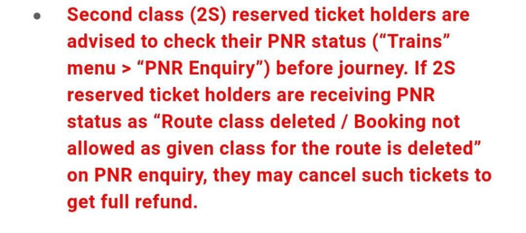यात्रीगण एक बात विशेषतः जान ले, रेल प्रशासन ने जिन यात्रिओंने 2S में अग्रिम आरक्षण कर रखा है, उन्हें यह सूचना दे रही है, अपनी रेल यात्रा आरम्भ करने से पहले PNR स्टेटस चेक कर लें और यदि स्टेटस में ‘क्लास रदद् किया गया है’ या आरक्षण रदद् बता रहा है तो अपना टिकट रदद् कर पूरा रिफण्ड प्राप्त कर सकते है।