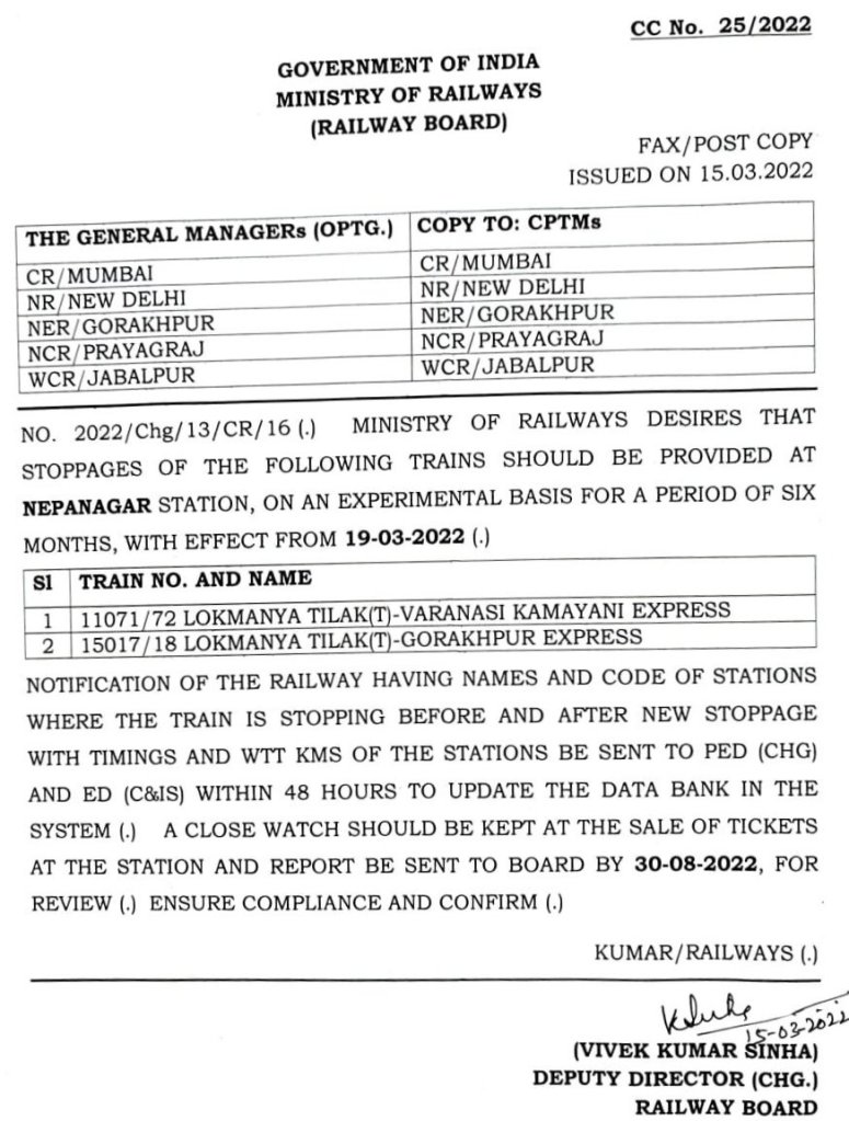 11071/72 लोकमान्य तिलक टर्मिनस वाराणसी कामायनी और 15017/18 लोकमान्य तिलक टर्मिनस गोरखपुर काशी इन दोनों प्रतिदिन चलनेवाली गाड़ियोंके नेपानगर स्टोपेजेस की पुनर्बहाली मिल गयी है। 19 मार्च से दोनोंही दिशाओं से यह गाड़ियाँ नेपानगर में रुकने लग जाएगी।