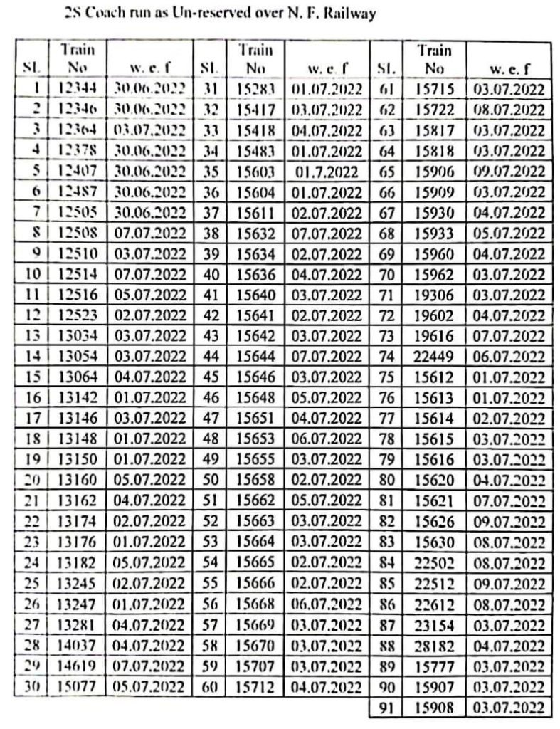 NFR पूर्वोत्तर सीमान्त रेल ने अपनी 91 मेल/एक्सप्रेस गाड़ियोंकी सूची और उनमें अनारक्षित टिकटोंके जारी किए जाने की तिथियाँ सूचित कर दी है। गौरतलब यह देख सकते है, लगभग सभी तिथियाँ जून के आखिरी सप्ताह या जुलाई के प्रथम सप्ताह की है।