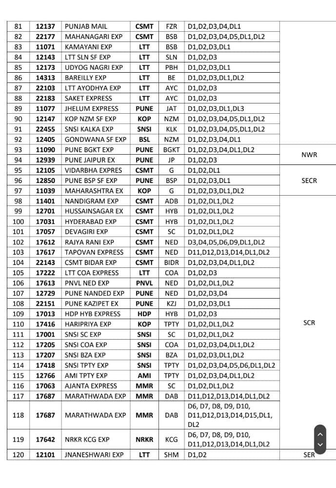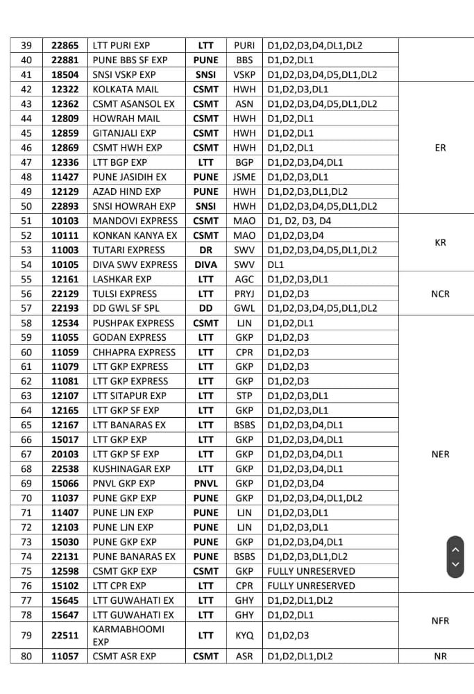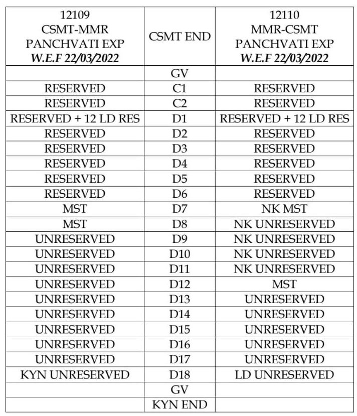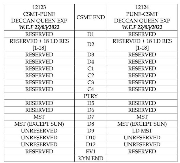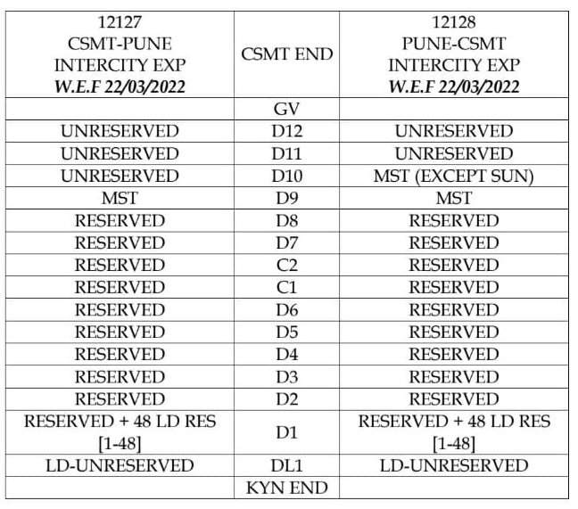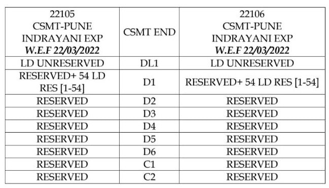 मुम्बई पुणे के बीच चलने वाली 12127/28 इण्टरसिटी, 22105/06 इंद्रायणी, 11007/08 डेक्कन, 11009/10 सिंहगड, 12123/24 डेक्कन क्वीन यह और मुम्बई मनमाड़ के बीच 12109/10 पंचवटी गाड़ियाँ 22 मार्च से अनारक्षित हो जाएगी। अनारक्षित डिब्बों की संरचना निम्नलिखित है।