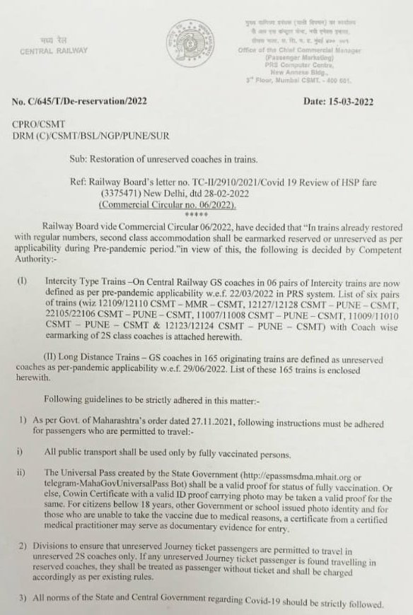 मध्य रेलवे ने 6 जोड़ी इण्टरसिटी एक्सप्रेस गाड़ियोंमें 22 मार्च से द्वितीय श्रेणी साधारण अनारक्षित टिकट खोलने का निर्णय लिया है। जिसमे 5 जोड़ी मुम्बई पुणे के बीच और 1 जोड़ी मुम्बई मनमाड के बीच चलने वाली गाड़ियाँ है।