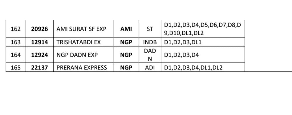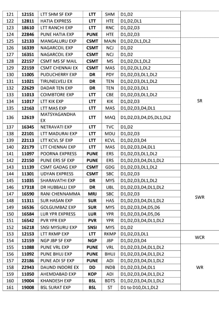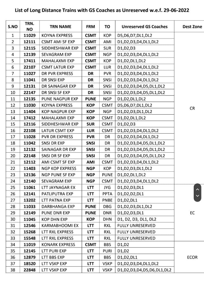 लम्बी दूरी के लिए चलनेवाली गाड़ियोंकी सूची, यह गाड़ियोंमे 29 जून से अनारक्षित टिकट बहाल किये जायेंगे।