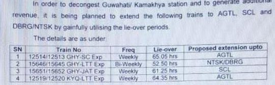 इस पत्र में 12514/13 गौहाटी सिकन्दराबाद गौहाटी साप्ताहिक एक्सप्रेस को अगरतला, 15651/52 गौहाटी जम्मूतवी गौहाटी साप्ताहिक एक्सप्रेस को सिल्चर, 15645/46 गौहाटी लोकमान्य तिलक टर्मिनस गौहाटी द्विसाप्ताहिक एक्सप्रेस को न्यू तिनसुकिया या डिब्रूगढ़ और 12520/19 कामाख्या लोकमान्य तिलक टर्मिनस कामाख्या साप्ताहिक एक्सप्रेस को अगरतला तक ले जा कर टर्मिनेट करने की संभावनाएं देखने के लिए, सम्बन्धित मण्डल कहा गया है। इन गाड़ियोंका विस्तार इनके गौहाटी/कामाख्या स्टेशनोंपर तकरीबन 50 से 60 घंटे तक के लंबे ‘लाय ओवर पीरियड’ के कारण सम्भव हो सकता है।