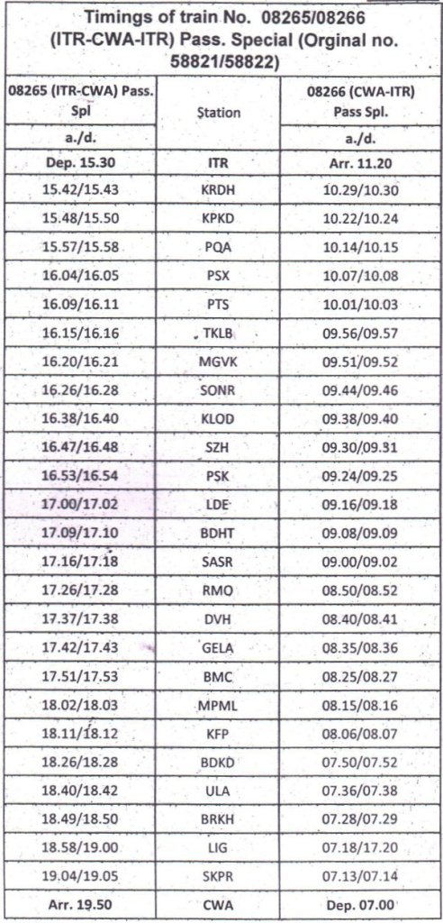 दक्षिण पूर्व मध्य रेलवे , नागपुर मण्डल द्वारा दिनांक 21 मार्च ‘2022 से इतवारी – छिंदवाड़ा – इतवारी के मध्य स्पेशल ट्रेन क्र. 08265 – 08266 और तुमसर रोड़ – तिरोड़ी- तुमसर रोड़ के मध्य डेमू क्र. 07813- 07814 की सुविधा।