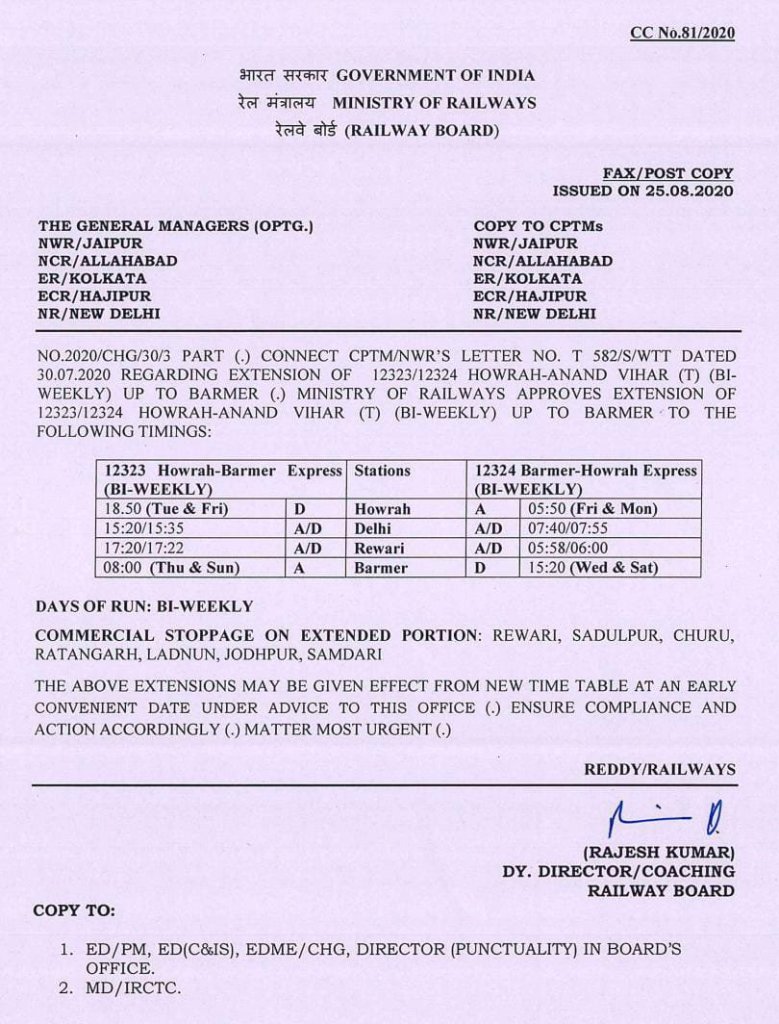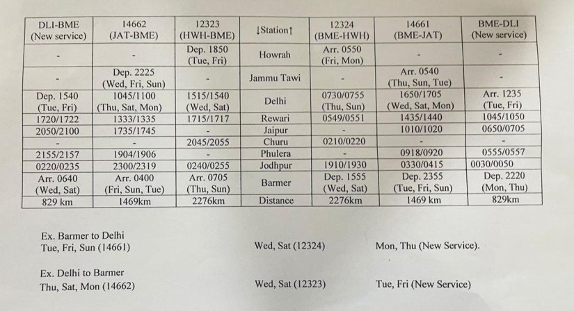 इसमे स्पष्ट किया है, नई सेवा द्विसाप्ताहिक गाड़ी के स्वरूप मे चलाई जाएगी, चूंकि हावड़ा बाड़मेर के बीच 12323/24 यह द्विसाप्ताहिक और 14661/62 यह मालाणी एक्स्प्रेस का संक्रमणकाल के बाद का सुधारित (?) रूप त्रिसाप्ताहिक सेवा, चल ही रही थी। कुल मिलाकर पूरे सप्ताह बाड़मेर – दिल्ली के बीच यात्री सेवा पुनर्स्थापित की जाएगी, यह इस ट्वीट का संदेश है।