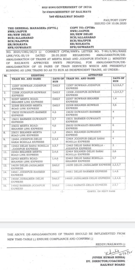 संक्रमणकाल मे सारी यात्री सेवा बंद कर दी गई थी, अर्थात मालिणी एक्स्प्रेस लिंक स्वरूप मे प्रतिदिन चलनेवाली गाड़ी थी और इसका जोधपुर मे जो जैसलमेर / बाड़मेर का लिंक/डीलिंक बन्द होना तो पहले ही तय हो गया था। इसके दो टुकड़े अब सीधे सप्ताह मे 4 दिन जैसलमेर और 3 दिन बाड़मेर के लिए तय कर दिए गए। निम्नलिखित रेल बोर्ड के पत्र मे सूची क्रमांक 13, 14, 15, 16 देखिए।