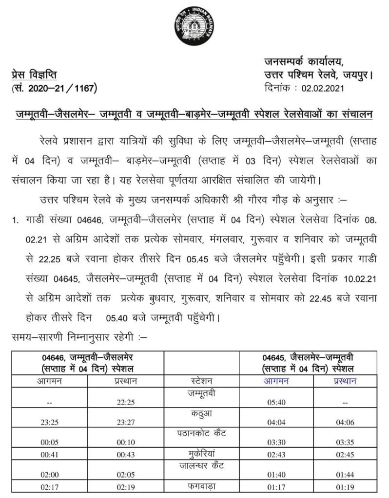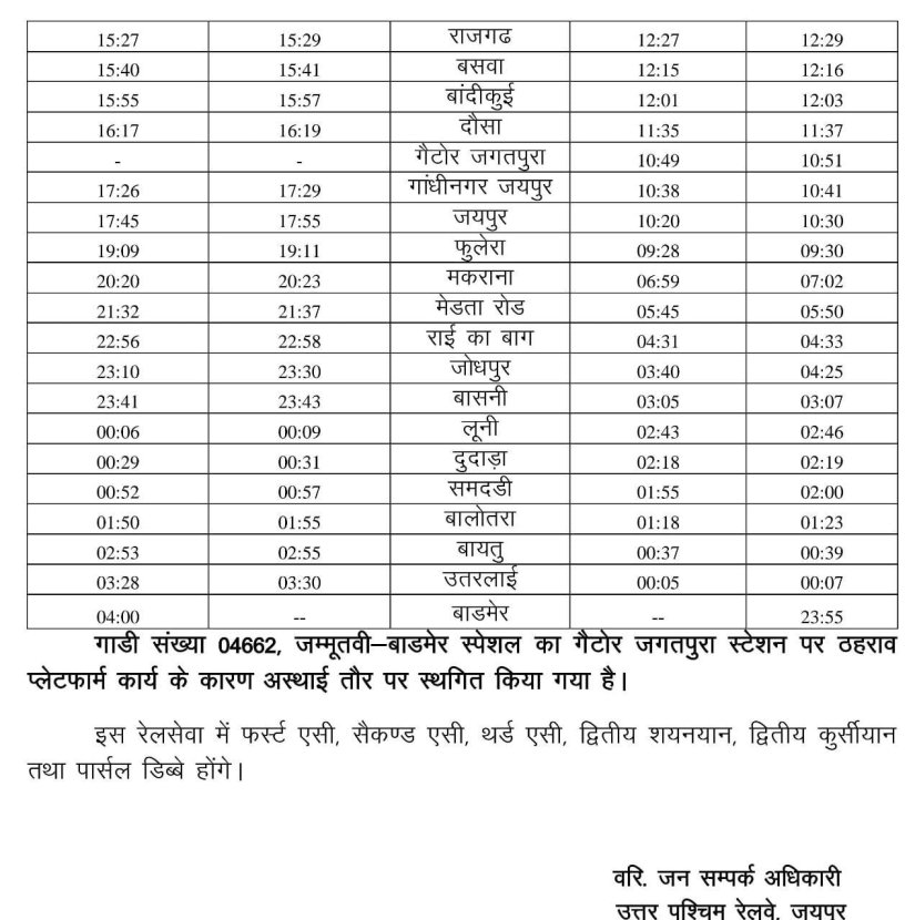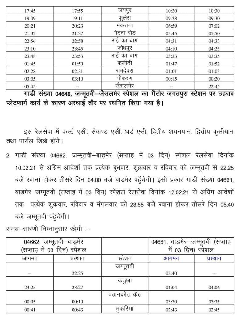 और जैसे की पहले तय था, दिल्ली की जगह विस्तार कर के जम्मू तवी से सप्ताह मे 4 दिन जैसलमेर के लिए और 3 दिन बाड़मेर के लिए विशेष सेवा के तौर पर गाडियाँ चल निकली। हालांकि यह भी 14645/46 जम्मू तवी से दिल्ली के बीच प्रतिदिन चलनेवाली शालीमार एक्स्प्रेस का विस्तार था। रैक की एडजस्टमेंट कर के यह व्यवस्था जमायी गई।