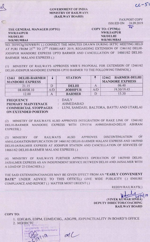 तय कुछ किया गया, लेकिन जैसलमेर और बाड़मेर की जनता तो आक्रोशित हो रही थी दोनों शहरोकी सेवा मे कटौती होना लिख दिया गया था। खैर, होना कुछ और था। एक विचार यह भी किया गया। 14659/60 दिल्ली जैसलमेर को प्रतिदिन कर दिया जाए और बाड़मेर प्रतिदिन के लिए 12461/62 दिल्ली जोधपुर के बीच चलने वाली मंडोर एक्स्प्रेस को जोधपुर से आगे बाड़मेर तक विस्तारित करने की बात निश्चित की गई। मंडोर एक्स्प्रेस का रैक 12915/16 अहमदाबाद दिल्ली आश्रम एक्स्प्रेस से लिंक किया जाए तो यह प्रयास संभव हो सकता था, मगर… यह मगर बड़ा पेचीदा होता है। कहाँ जोधपुर मे कुछ हुवा या पश्चिम रेल्वे के अहमदाबाद मे, यह मंडोर एक्स्प्रेस दिल्ली जोधपुर के बीच यथावत बनी रही, और कभी बाड़मेर के लिए नही चली।