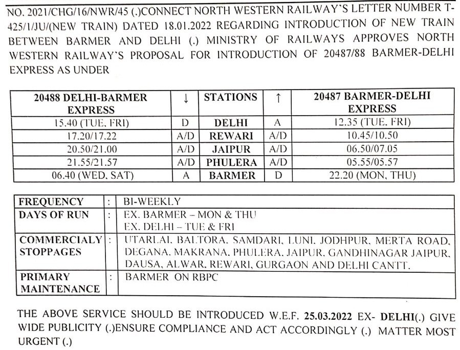 दो दिन हावड़ा – बाड़मेर, तीन दिन जम्मूतवी – बाड़मेर और यह नई द्विसाप्ताहिक सेवा दिल्ली – बाड़मेर के बीच। यूं किया जा रहा है, दिल्ली – बाड़मेर के बीच प्रतिदिन चलनेवाली मालाणी एक्सप्रेस की कमी को पूरा।