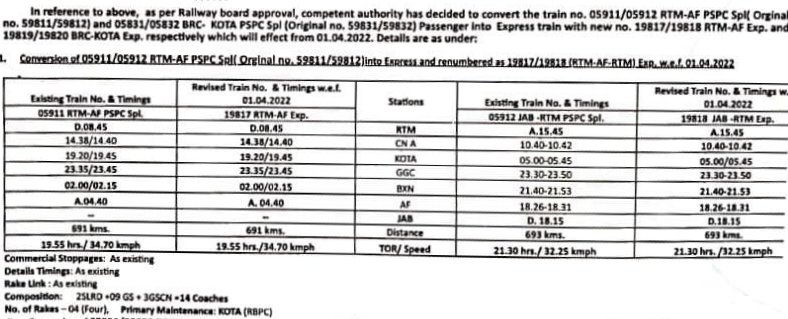 05911/12 रतलाम – आगरा किला – यमुना ब्रिज – रतलाम सवारी विशेष गाड़ी के दिनांक 01 अप्रेल से 19817 रतलाम आगरा किला एक्सप्रेस और 19818 यमुना ब्रिज रतलाम एक्सप्रेस यह नए गाड़ी क्रमांक रहेंगे। साथ ही 05831/31 कोटा – वडोदरा – कोटा सवारी विशेष के गाड़ी क्रमांक भी 19819/20 01 अप्रेल से ही बदल जाएंगे।
