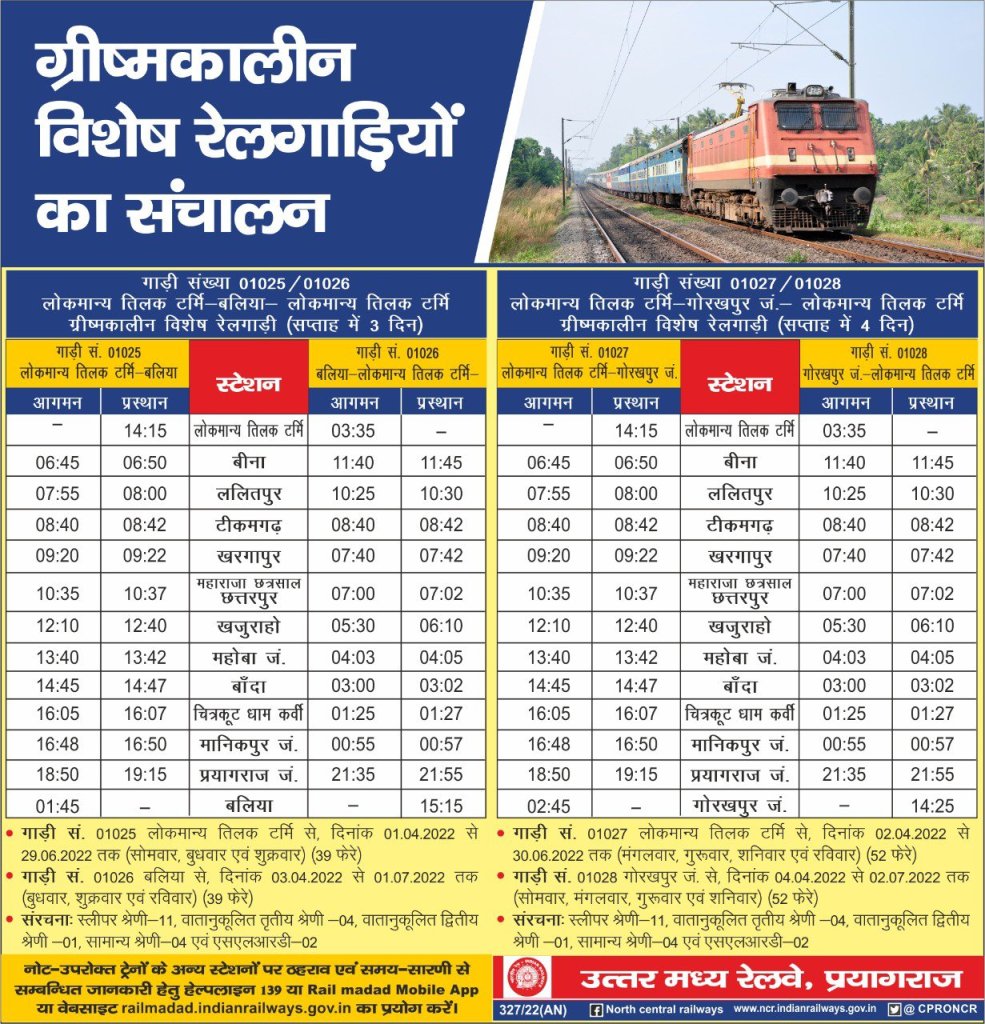 01026 स्पेशल गाड़ी दिनांक 03.04.2022 से 01.07.2022 तक प्रत्येक बुधवार, शुक्रवार एवं रविवार को 15.15 बजे बलिया से प्रस्थान कर तीसरे दिन 03.35 बजे लोकमान्य तिलक टर्मिनस पहुंचेगी।