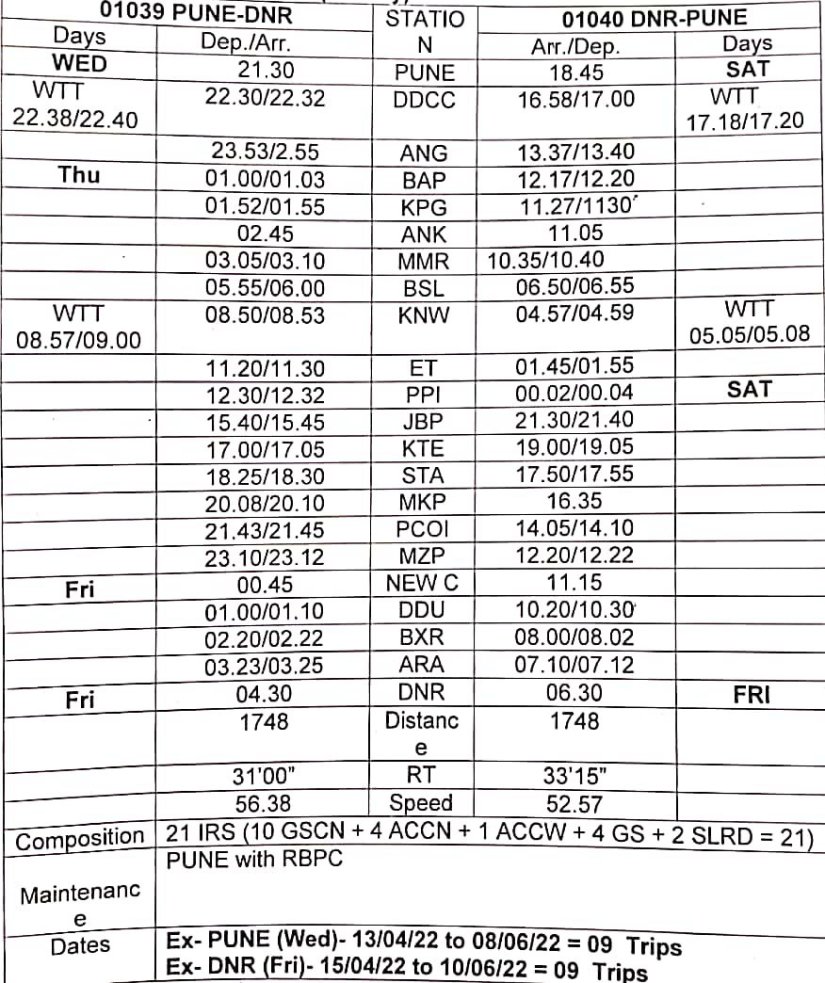2: 01039 पुणे दानापुर साप्ताहिक विशेष दिनांक 13 अप्रेल से 08 जून तक प्रत्येक बुधवार को रवाना होगी और वापसीमे 01040 दानापुर पुणे साप्ताहिक विशेष दिनांक 15 अप्रेल से 10 जून तक प्रत्येक शुक्रवार को रवाना होगी।