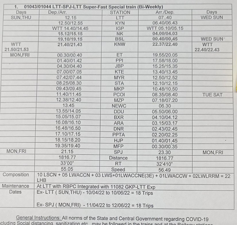 1: 01043 लोकमान्य तिलक टर्मिनस समस्तीपुर द्विसाप्ताहिक विशेष दिनांक 10 अप्रेल से 09 जून तक प्रत्येक रविवार एवं गुरुवार को लोकमान्य तिलक टर्मिनस से समस्तीपुर के लिए रवाना होगी वापसीमे 01044 समस्तीपुर लोकमान्य तिलक टर्मिनस द्विसाप्ताहिक विशेष दिनांक 11 अप्रेल से 10 जून तक प्रत्येक सोमवार एवं शुक्रवार को समस्तीपुर से लोकमान्य तिलक टर्मिनस के लिए रवाना होगी।