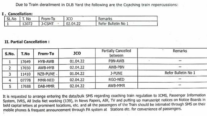 इसके अलावा 17649/50 हैदराबाद औरंगाबाद हैदराबाद एक्सप्रेस, औरंगाबाद की जगह परभणी से परिचालित होगी। परभणी से औरंगाबाद के बीच रदद् रहेगी।
