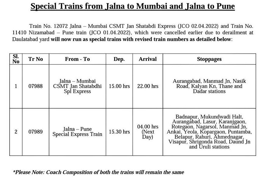 पहले परिपत्रक में कुछ गाड़ियोंको नियंत्रित करने की बात की गई है, उनमे से 12072 जालना मुम्बई जनशताब्दी को बाद में रदद् करार किया गया और उसकी रेक लिंक में चलनेवाली 12109 मुम्बई मनमाड़ पंचवटी एक्सप्रेस भी आज रदद् की गई है।