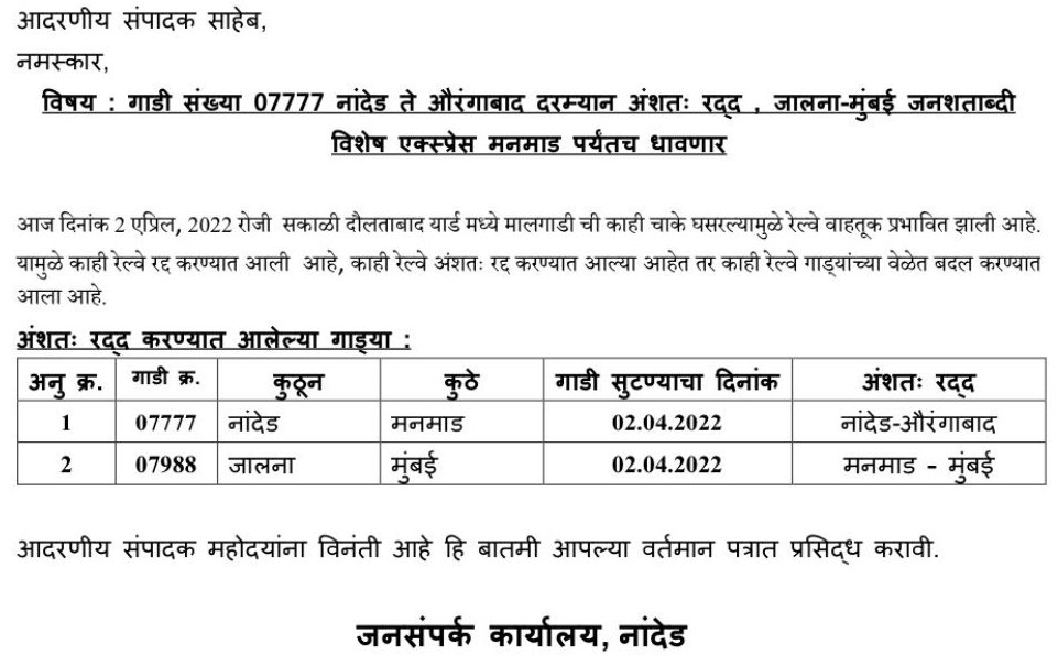 पहले जालना मुम्बई जनशताब्दी को मुम्बई तक ले जाना तय किया गया था, उपरान्त इस गाड़ी को 07988 को मनमाड़ तक सीमित जर दिया है। यह गाड़ी अब जालना से मनमाड़ आकर समाप्त कर दी जाएगी। मनमाड़ से मुम्बई के बीच रदद् रहेगी। दरअसल यह 12110 मनमाड़ मुम्बई पंचवटी एक्सप्रेस के रैक की माँग हेतु लिया गया निर्णय है। इसी तरह 07777 का रैक भी सेट किया गया है।