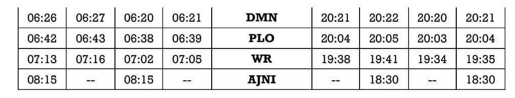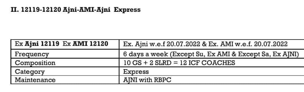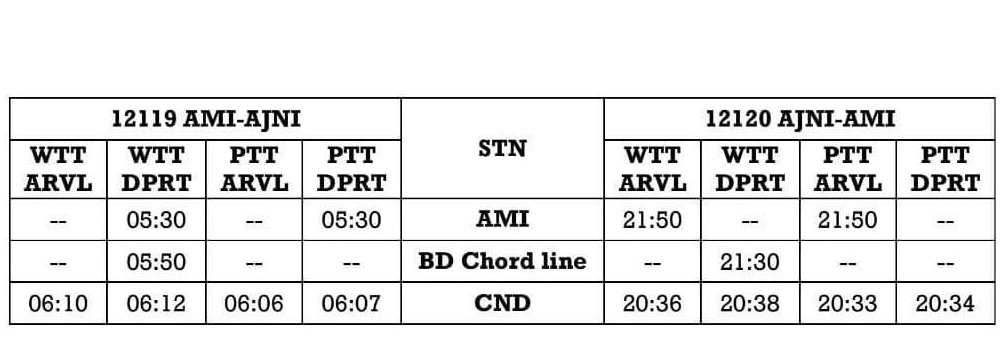 12119 अमरावती अजनी इन्टरसिटी एक्सप्रेस दिनांक 20 जुलाई से सप्ताह में 6 दिन, प्रत्येक रविवार को छोड़कर चलना शुरू कर देगी। वापसीमे 12120 अजनी अमरावती इन्टरसिटी एक्सप्रेस दिनांक 20 जुलाई से सप्ताह में 6 दिन, प्रत्येक शनिवार को छोड़कर चलना शुरू कर देगी। निम्नलिखित समयसारणी में PTT अंतर्गत समय आम यात्रिओंके लिए है।