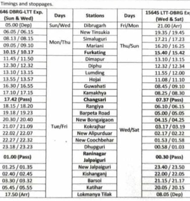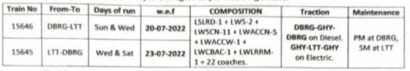 दिनांक 20 जुलाई से 15646 गौहाटी लोकमान्य तिलक टर्मिनस एक्सप्रेस बजाय गौहाटी के, डिब्रूगढ़ से चलेगी और वापसीमे दिनांक 23 जुलाई से 15645 लोकमान्य तिलक टर्मिनस से चलकर डिब्रूगढ़ तक जाना शुरू कर देगी। गाड़ी का डिब्रूगढ़ तक विस्तार होने की वजह से, परिचालन में कटिहार से डिब्रूगढ़ तक इन दोनों गाड़ियोंके समय मे बदलाव किया गया है, जो निम्नलिखित है।