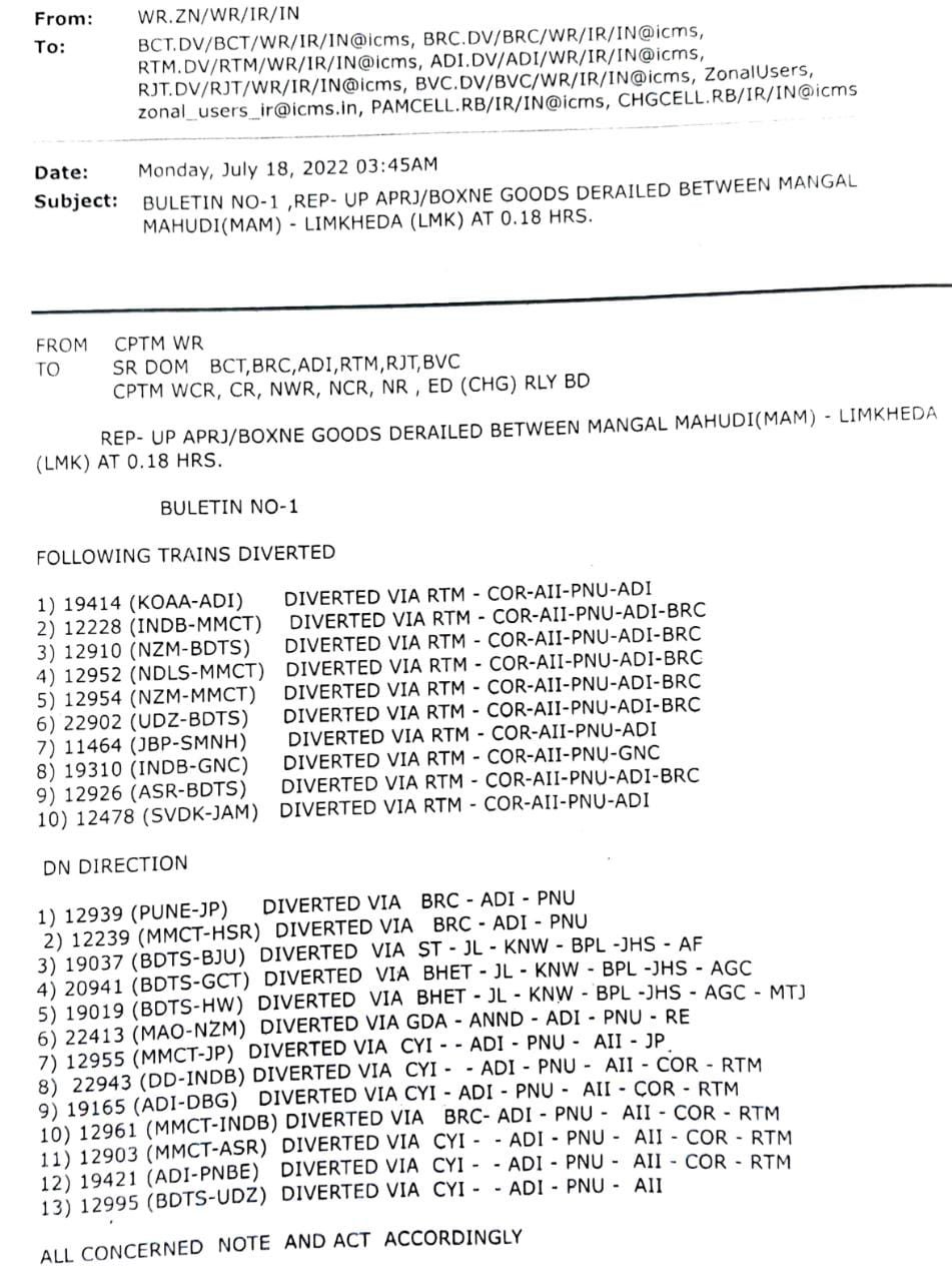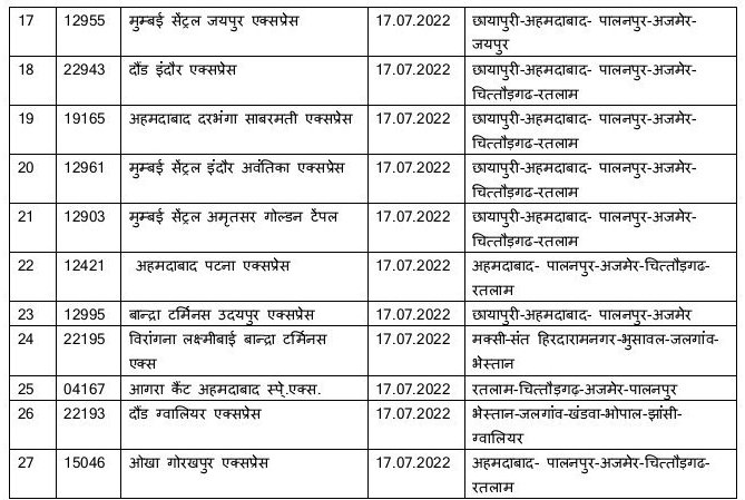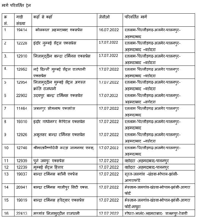 रतलाम से वडोदरा, अहमदाबाद एवं मुम्बई की ओर जाने वाली 10 गाड़ियोंको चित्तौड़गढ़, अजमेर, पालनपुर, अहमदाबाद मार्ग से आगे लाया जा रहा है तो वडोदरा से रतलाम की ओर जानेवाली गाड़ियोंको भी अहमदाबाद, पालनपुर अजमेर होकर चलाया जा रहा है।
