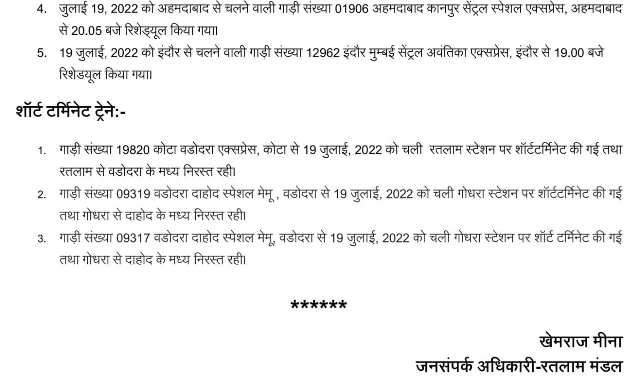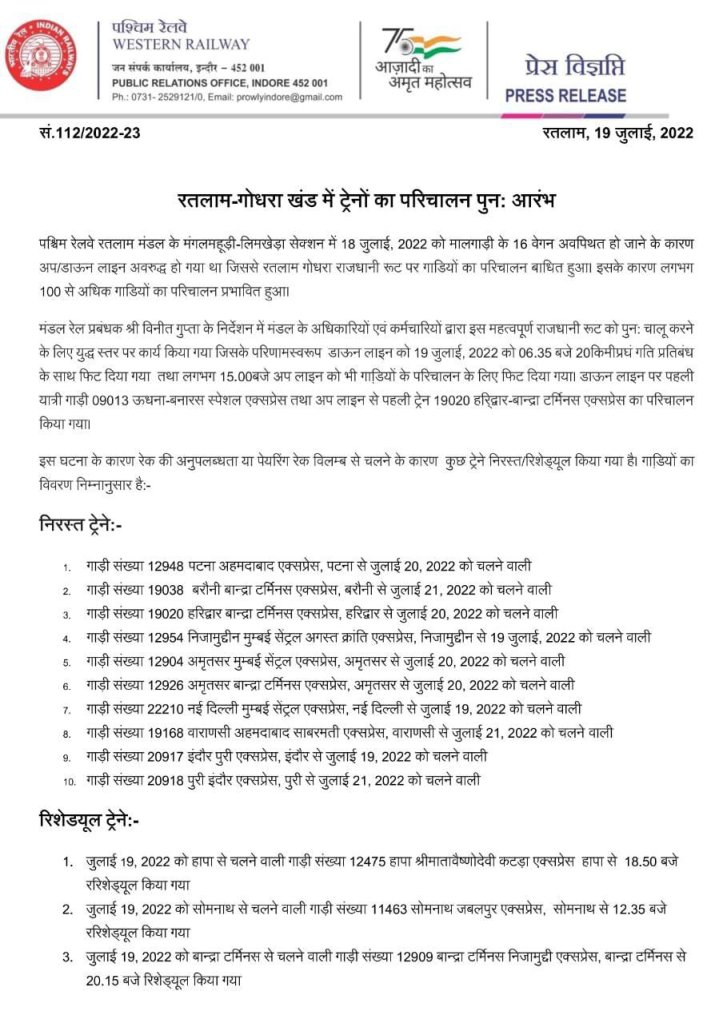 रेल कर्मियोंके अथक प्रयास और दिन-रात एक कर ट्रैक से गिरे डिब्बे हटाना रंग लाया है। आज मुख्य रेल मार्ग से गाड़ियाँ निकलना शुरू हो गया है। यज्ञपी कुछ गाड़ियोंको मार्ग परिवर्तन कर चलाये जाने से उनके रैक समयपर अपने गन्तव्यों पर नही पहुंच सके और उस कारण रैक शेयरिंग वाली गाड़ियाँ रद्द करनी पड़ी या उन्हें देरीसे छोड़ा जाएगा। इस सम्बंध में रतलाम मण्डल का एक परिपत्रक जारी हुवा है, उसे यहां प्रस्तुत कर रहे है।