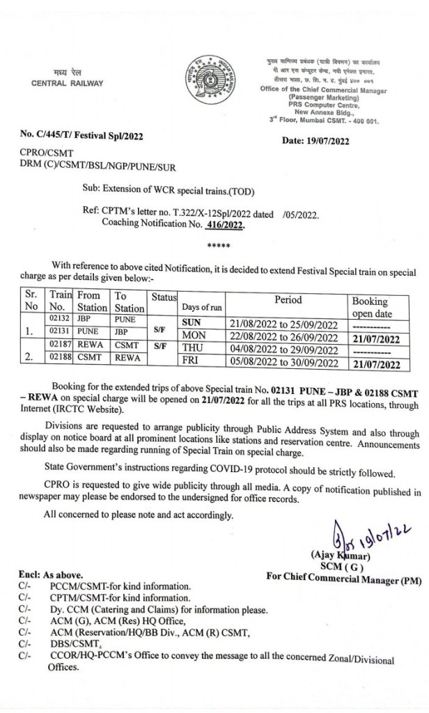 मुंबई और रीवा और पुणे और जबलपुर के बीच चलने वाली त्योहार विशेष ट्रेनों की अवधि को निम्नानुसार विस्तारित किया जायेगा: