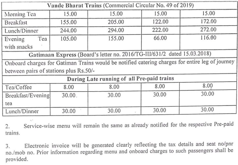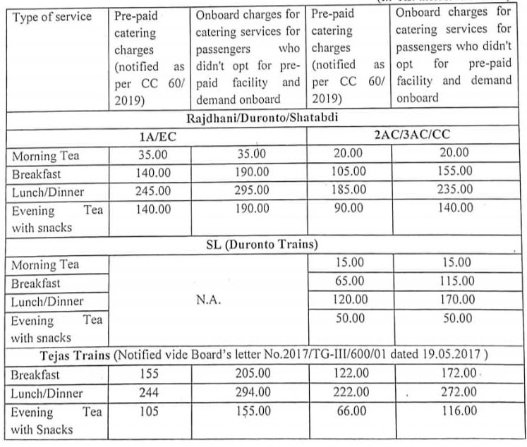 काफी हंगामे के बाद रेल विभाग नई रेट लिस्ट जारी कर दी है और उसमें सारी बातें स्पष्ट कर दी गयी है। निम्नलिखित दर पत्रक में प्रीबुकिंग की स्थिति के रेट्स भी स्पष्ट कर दिए गए है। सारे दर GST कर सम्मिलित है। हालांकि अभी भी जो यात्री बुकिंग करते वक्त अपने खानपान की बुकिंग नही करता उसे ₹50/- अतिरिक्त जोड़कर ही मूल्य चुकाना है, बस चाय को उस अतिरिक्त मूल्य देने से बख्शा गया है।