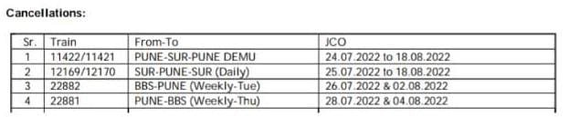 1) 11422/21 पुणे सोलापुर पुणे प्रतिदिन डेमू दिनांक 24 जुलै से 18 अगस्त तक रद्द रहेगी।