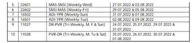 5) 16502 अहमदाबाद यशवंतपुर साप्ताहिक एक्सप्रेस दिनांक 31 जुलै से 07 अगस्त तक रद्द रहेगी वापसीमे 16501 यशवंतपुर अहमदाबाद साप्ताहिक एक्सप्रेस दिनांक 02 अगस्त से 09 अगस्त तक रद्द रहेगी।