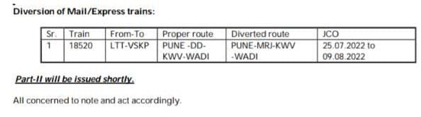 18520 लोकमान्य तिलक टर्मिनस विशाखापट्टनम प्रतिदिन एक्सप्रेस अपने प्रारंभिक स्टेशन लोकमान्य तिलक टर्मिनस से 25 जुलै से लेकर 09 अगस्त को निकलनेवाली गाड़ी अपने नियमित मार्ग पुणे – दौंड – कुरडुवाडी – वाड़ी की जगह परावर्तित मार्ग पुणे – मिरज – कुरडुवाडी – वाड़ी होकर चलाई जाएगी।