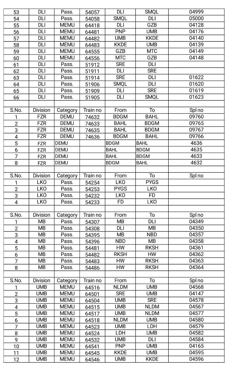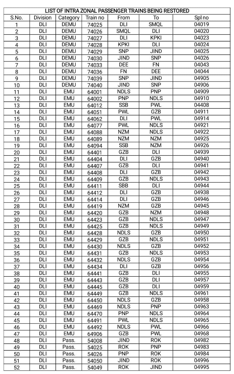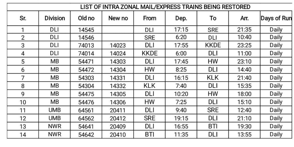 हमारे पास उत्तर रेलवे NR की सूची है जिसमे रेल प्रशासन ने उन्हें 116 गाड़ियाँ (14 मेल/एक्सप्रेस, 102 सवारी गाड़ियाँ) पुनर्स्थापित करने का आदेश दिया है। अब तक उत्तर रेलवे ने 77 गाड़ियाँ (12 मेल/एक्सप्रेस और 65 सवारी) गाड़ियाँ पुनर्स्थापित कर दी है और निर्देशित 116 गाड़ियाँ परिचालित करने के बाद उनकी संख्या 193 हो जाएगी।